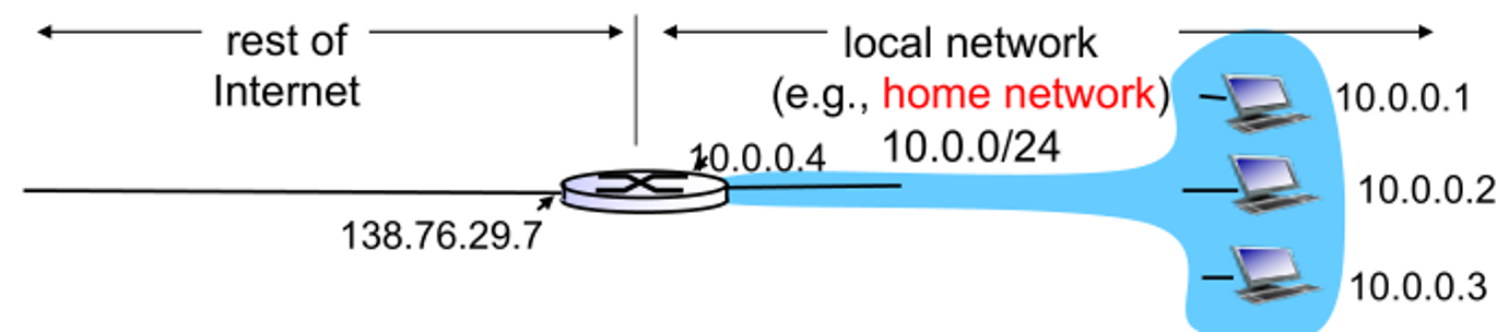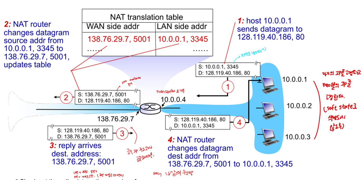 - 하나의 IP 주소를 여러 호스트가 사용 → NAT (Network Address Translation)