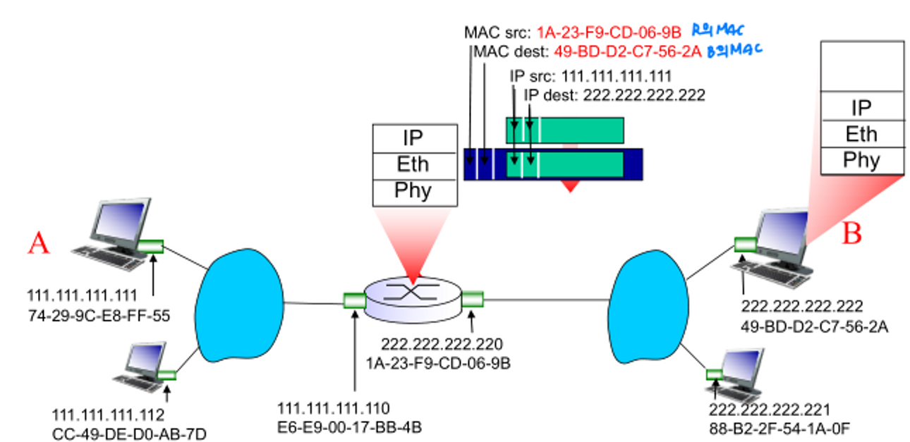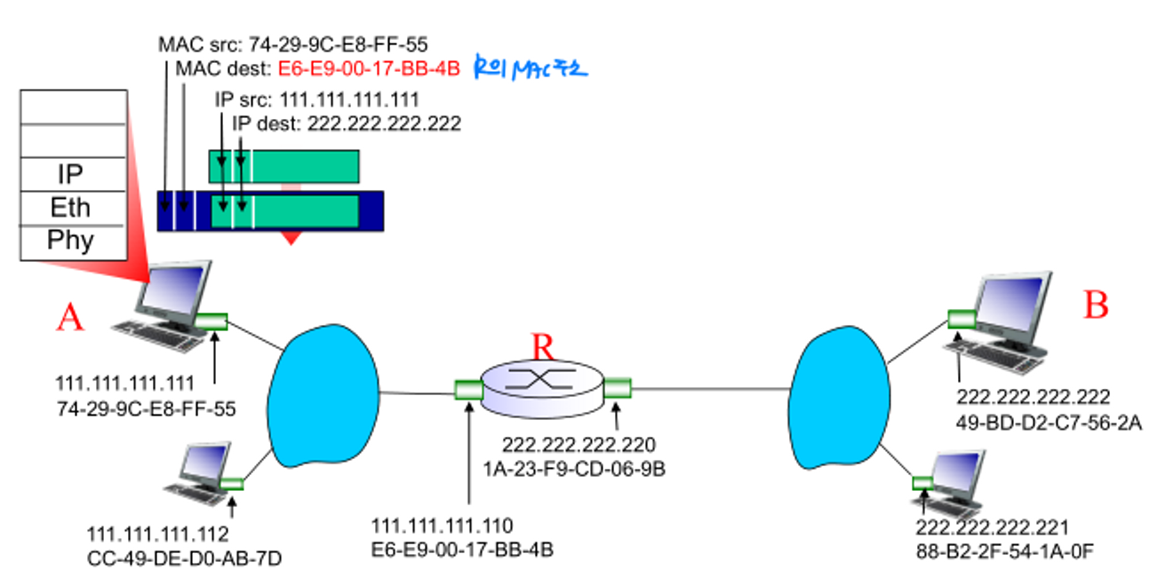- A는 R의 MAC주소를 목적지 주소로 하는 link-layer frame을 생성하고, frame은 A-to-B의 IP datagram을 포함한다. (encapsulation)