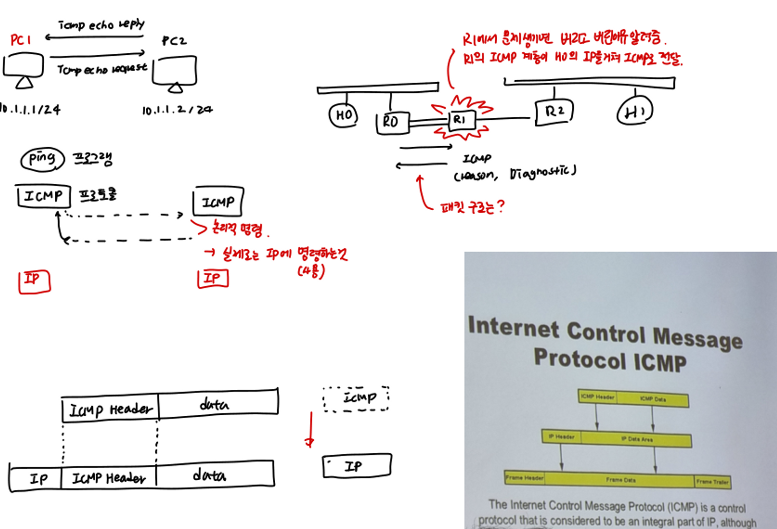 - 전송 시 R1에서 문제가 발생하면 패킷을 버리고 버린 이유를 알려준다. R1의 ICMP 계층이 H0의 IP를 거쳐 H0의 ICMP로 전달된다.