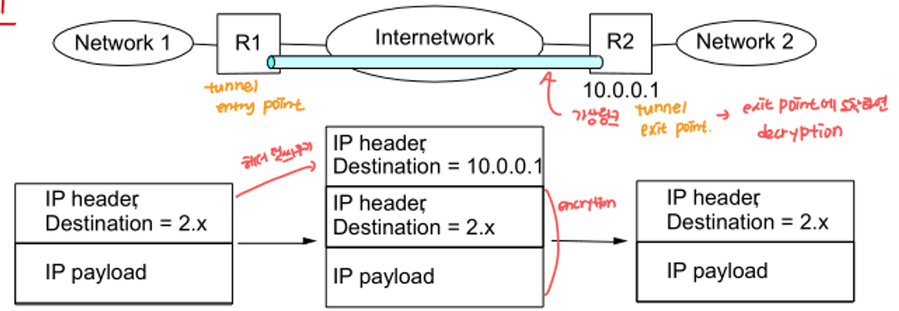 - tunnel entry point에서 header encapsulation과 함께 패킷 암호화, tunnel exit point에서 decapsulation & decryption 수행