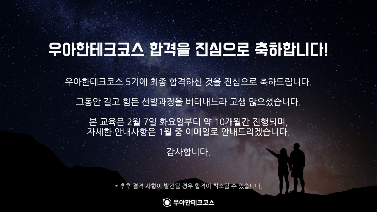 우테코를 합격하고 나니 뭔가 증명 받는 느낌이었다. 지금까지 해 온 것들이 틀리지 않았고, 잘 나아가고 있다는 증명. 1차 합격 때도, 최종 합격 때도 비슷한 기분이다. 그렇다고 자만하지는 않는다. 나는 아직 부족한 것이 많고, 알아야 할 것도, 깨달아야 할 것도 많기 때문이다. 아직 그 정도 실력이 되지도 않는다...
