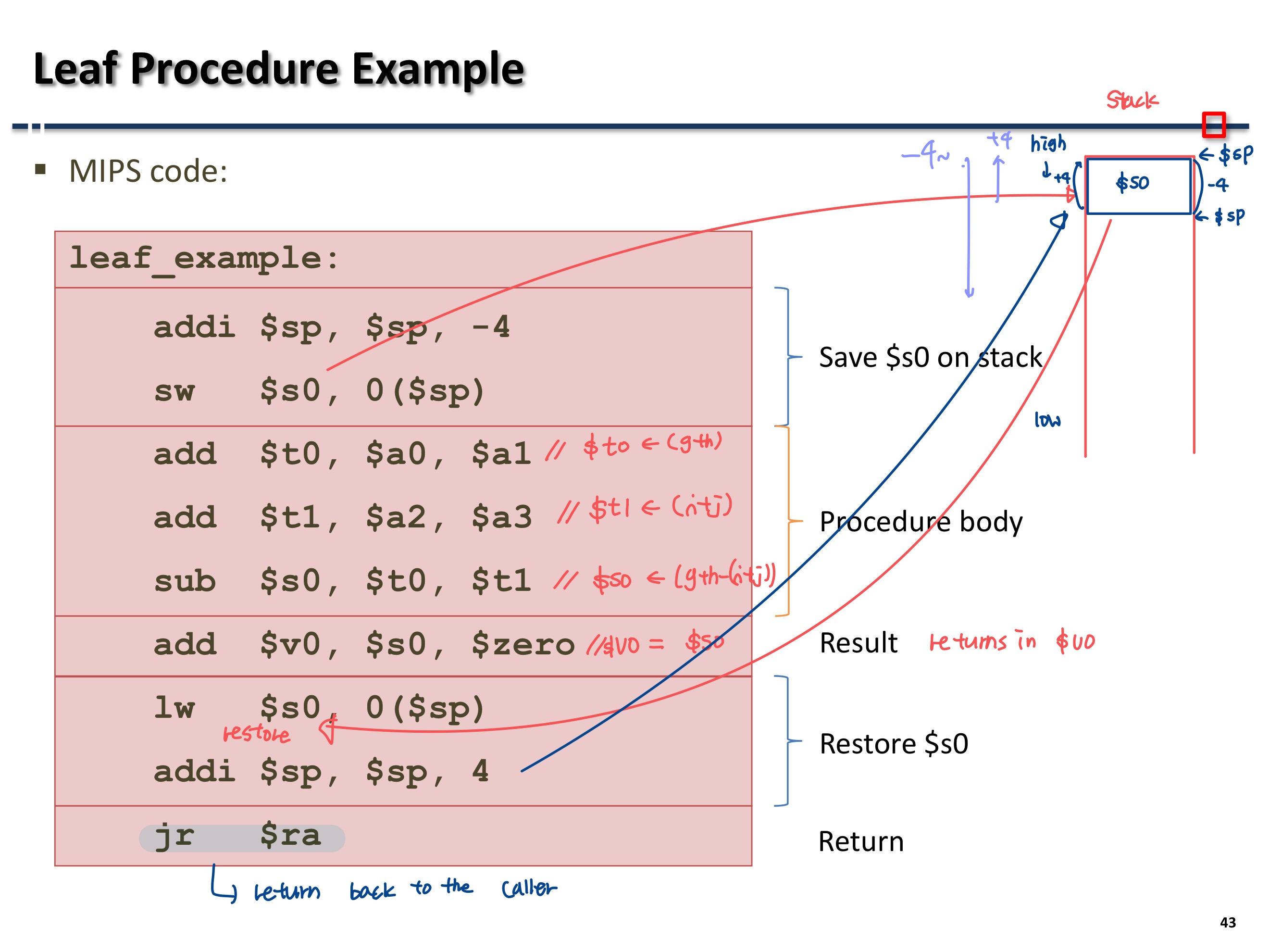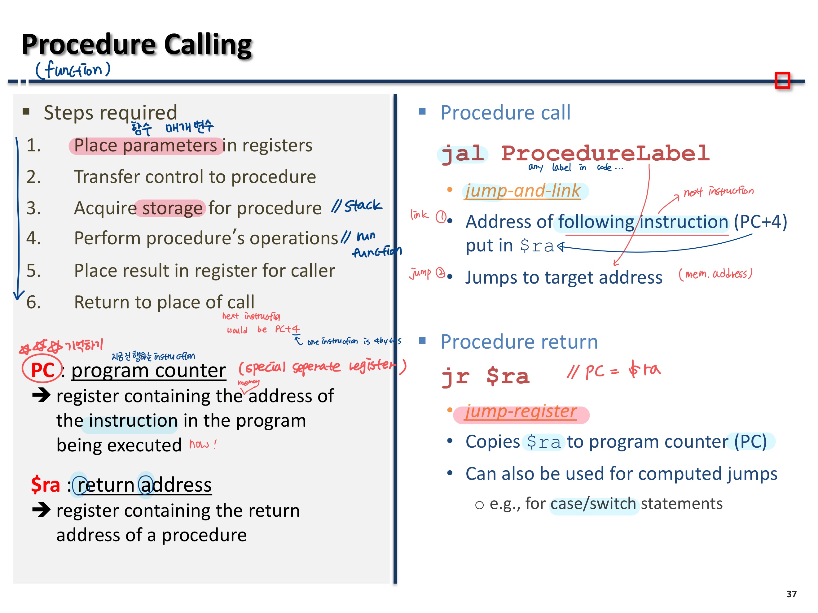 - More on MIPS registers$a0 - $a3 : arguments (4-7)$s0 - $s7 : 스택에 저장되는 값. $s0과 $s1를 callee에서 사용하면 이전에 있던 값이 사라지기 때문에 스택에 저장한 후, register를 사용하고 스택의 값을 복구하여 리턴한다. (즉, 이전의 값과 같다.)$sp : stack pointer (29)$ra : return address (31)