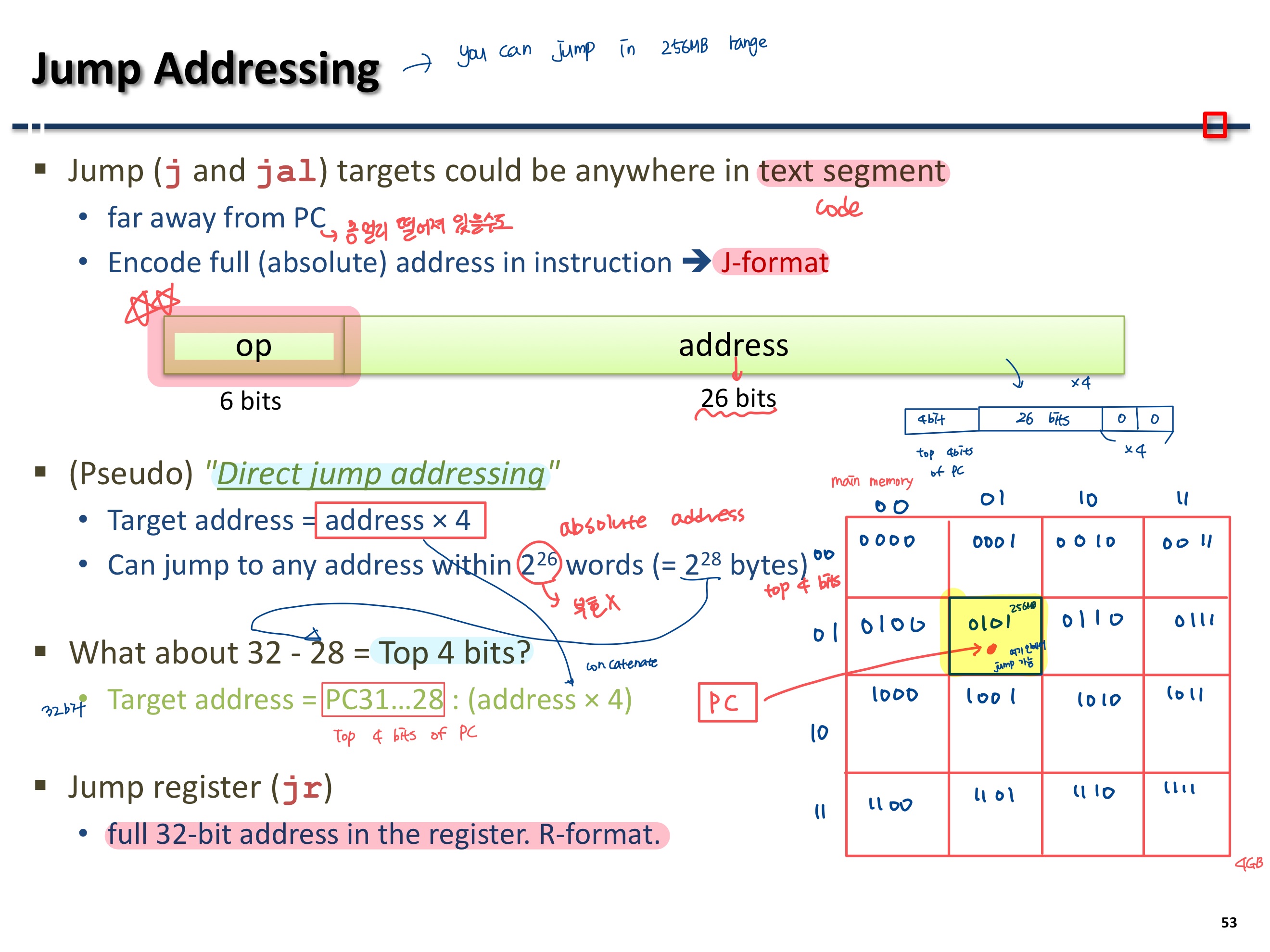 - 2^26 words 내의 모든 주소를 이동할 수 있다. (words는 4bytes 이므로 2^28bytes의 주소들)