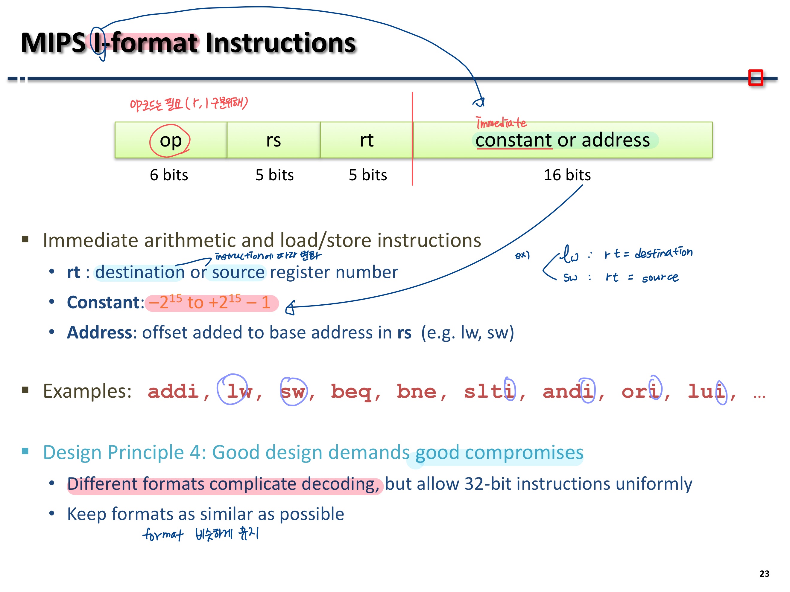 constant or address : 상수의 경우 -2^15 ~ 2^15 - 1까지, address는 rs에 더해질 offset이다. (16bits 임)
