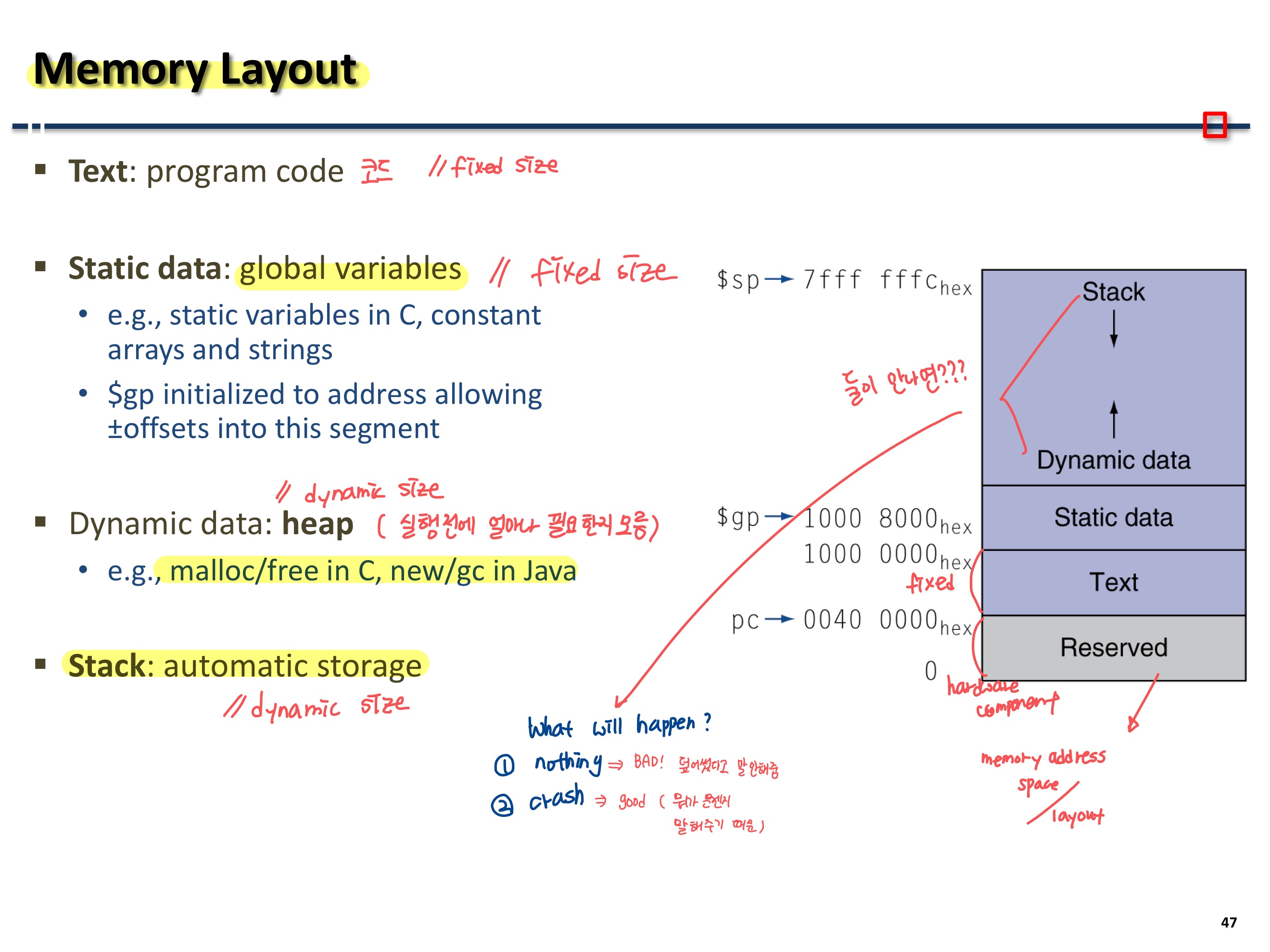 - Dynamic data : heap. 실행 전에는 얼마나 할당될 지 모르며, 실행 후에 크기가 결정되는 데이터 구조. 크기는 정해져 있지 않다.
