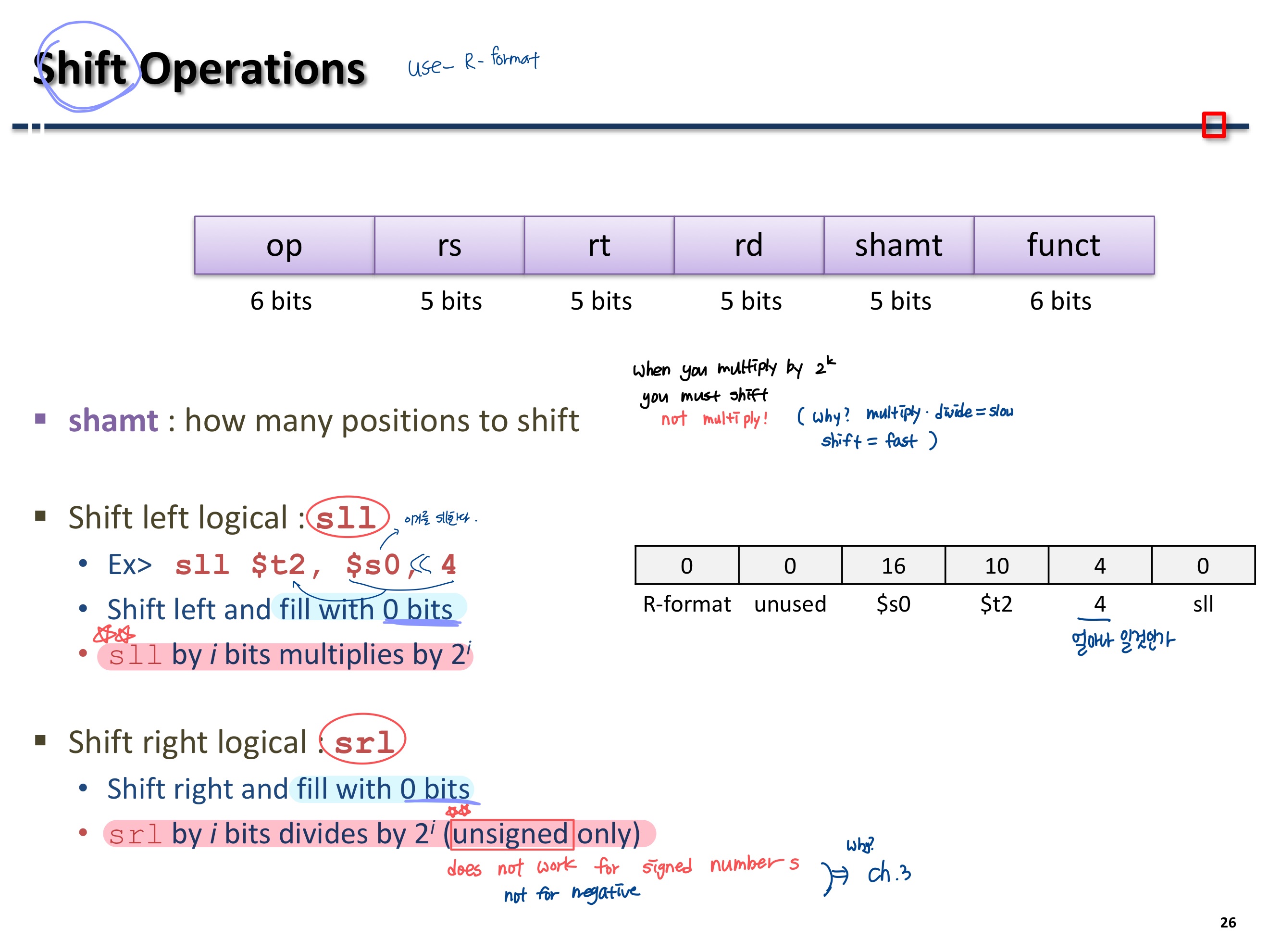 rt와 rd만 쓰이는데, rd를 shamt만큼 shift 연산한 값을 rt에 넣으라는 것이다.