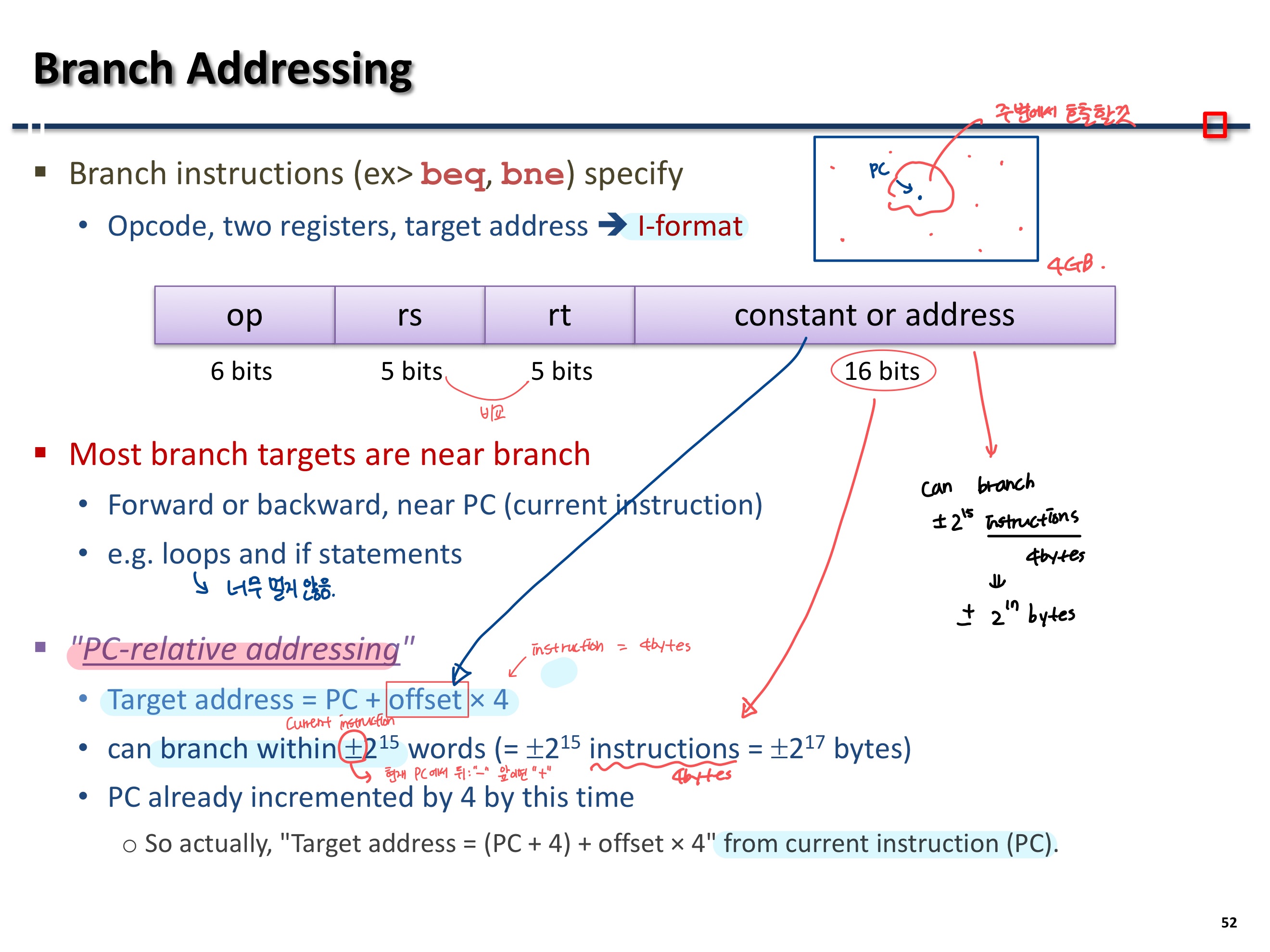 - branch는 -2^15 ~ 2^15까지의 instruction이 들어갈 수 있는데, MIPS의 instruction은 4bytes 이므로 총 +-2^17까지 저장할 수 있다.