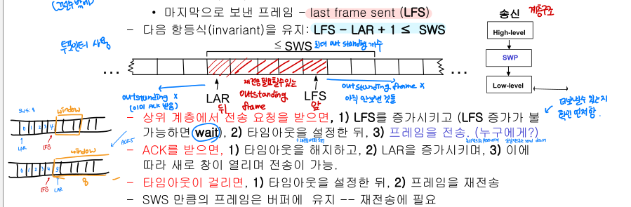 - ACK를 받으면 타임아웃을 해제하고, LAR을 증가시키며 이에 따라 새롭게 창이 열리며 전송이 가능해진다. (outstanding frame들이 해제되었으니 새로운 frame들을 보낼 수 있게 된다.)