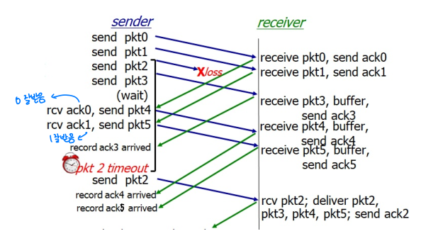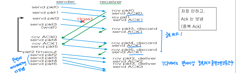 - Go-Back-N: 오류 발생한 지점부터 새 출발