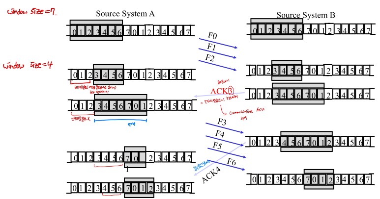 - ACK를 받지 않은 상태에서 보내지는 프레임 (outstanding frame)이 복수개로 늘어난다. 그 수는 window size에 맞게 제한된다.