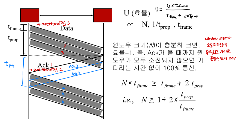 - 윈도우 크기 N이 충분히 크면, 효율은 1이 된다.