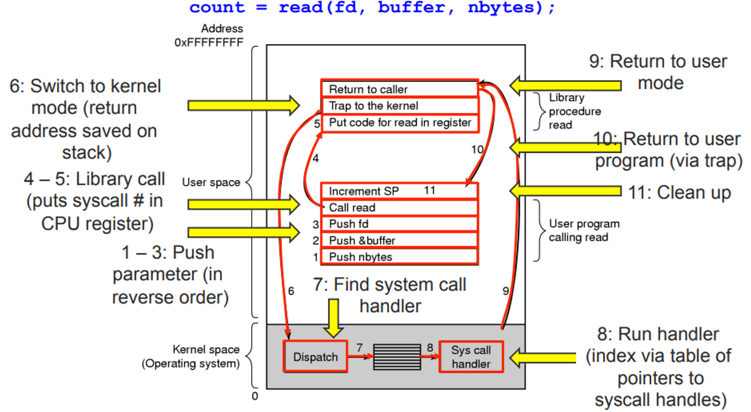 - compuiter program은 operating system’s kernel에 요청할 때 system call을 생성할 수 있다.