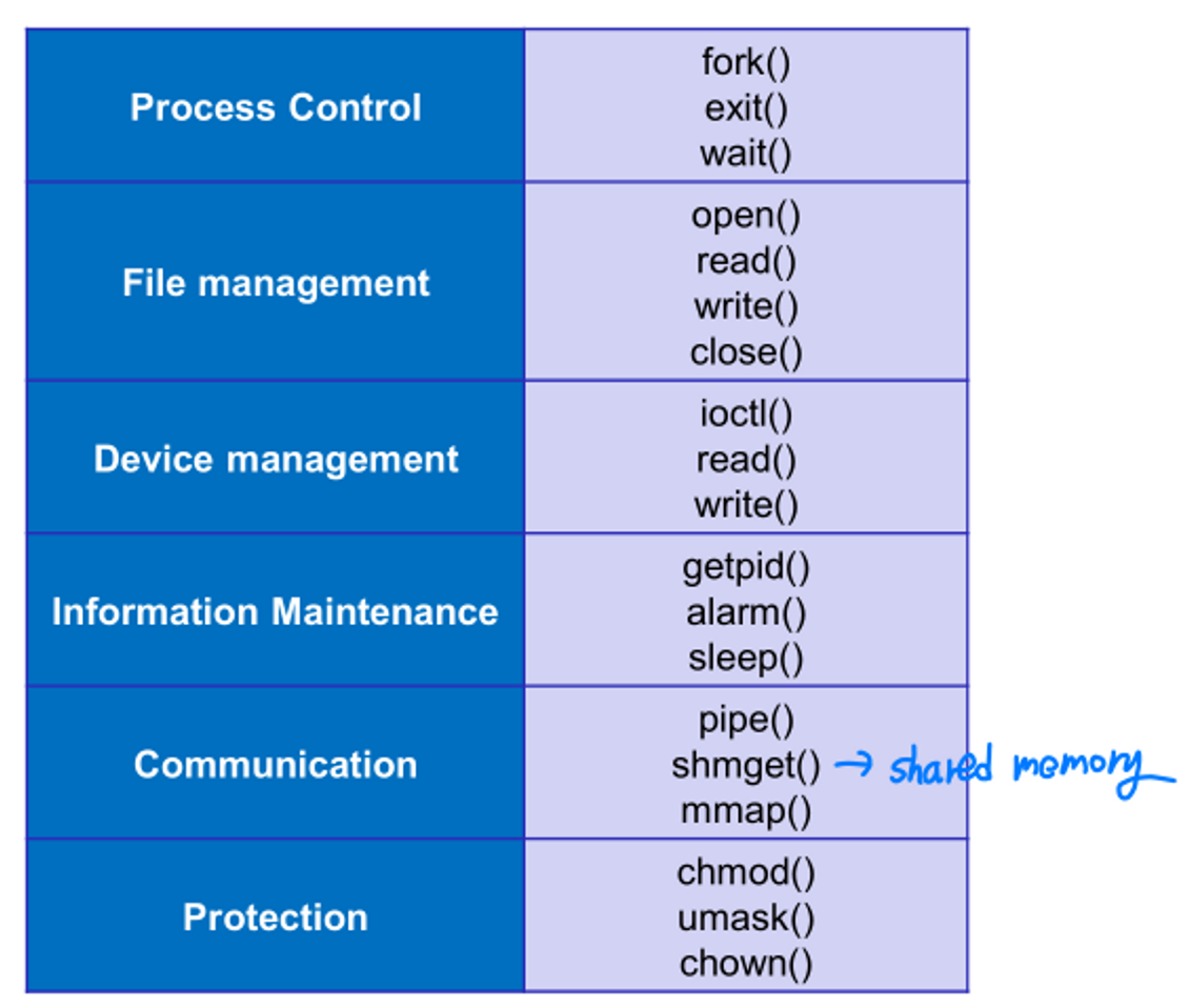- System call은 OS의 service를 user program에 Application Program Interface (API)를 통해 제공한다.