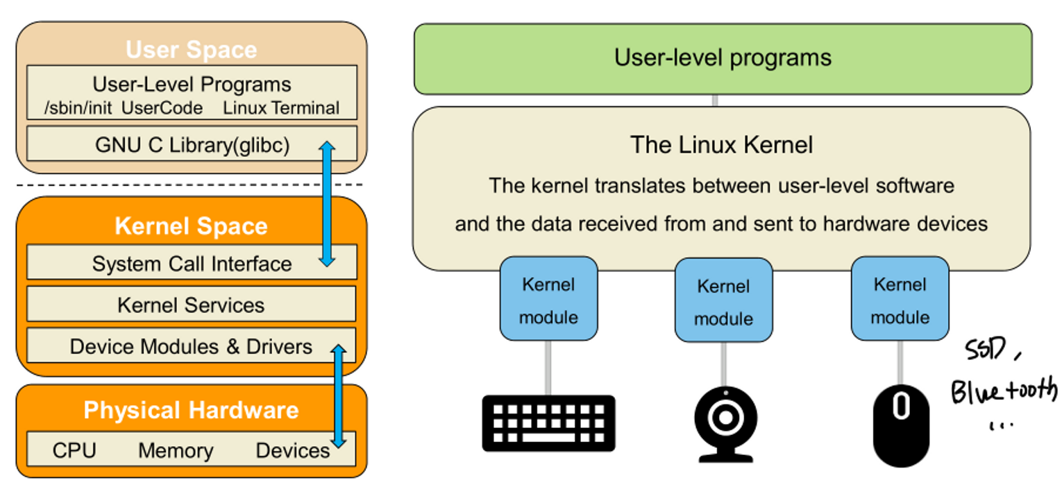 - module의 하나인 device driver는 kernel이 system에 연결되어 있는 hardware에 접근할 수 있도록 한다.