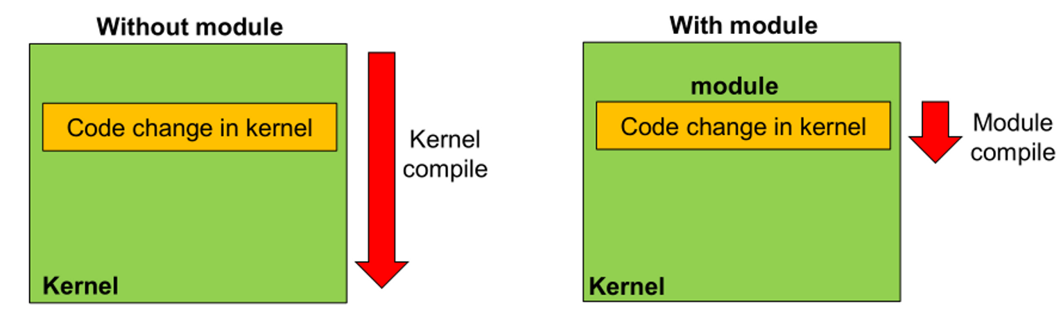 - module이 없으면, Linux kernel에 코드를 추가하기 위해서는 source code나 file을 kernel source tree에 추가하고 kernel을 recompile해야 한다.