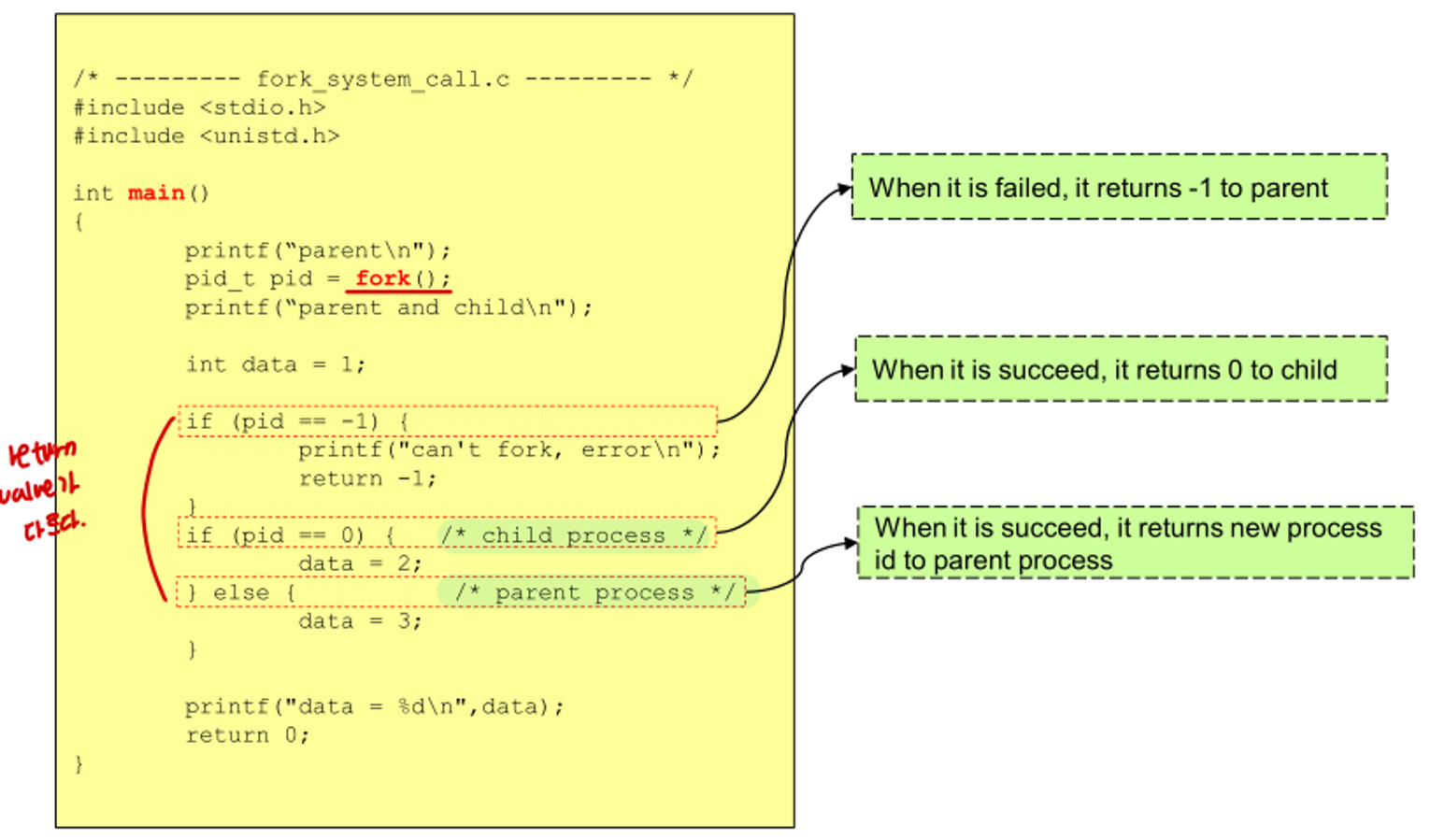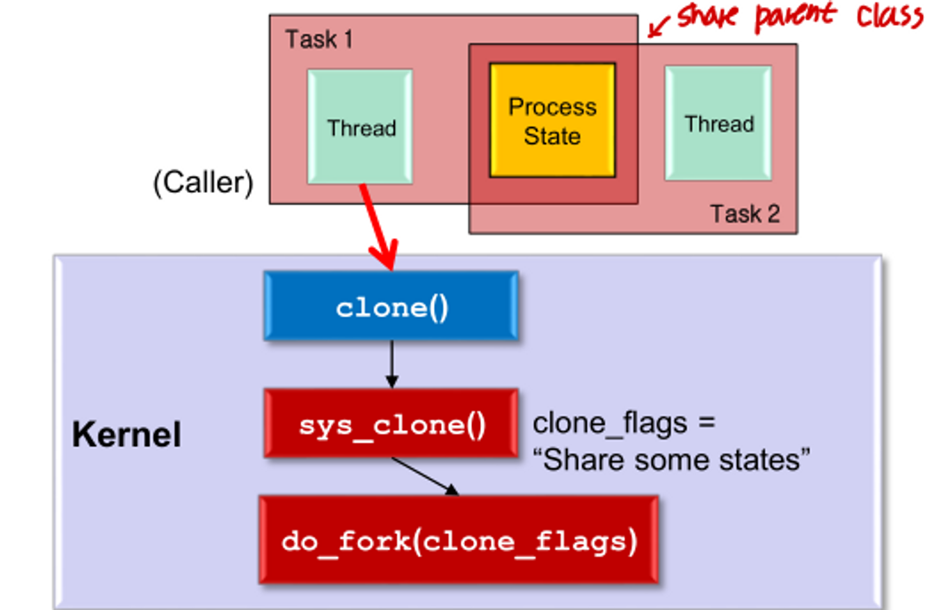 - fork와 다르게 child process가 calling process의 execution context의 일부를 공유하도록 허용한다. (memory space, file descriptors 등)