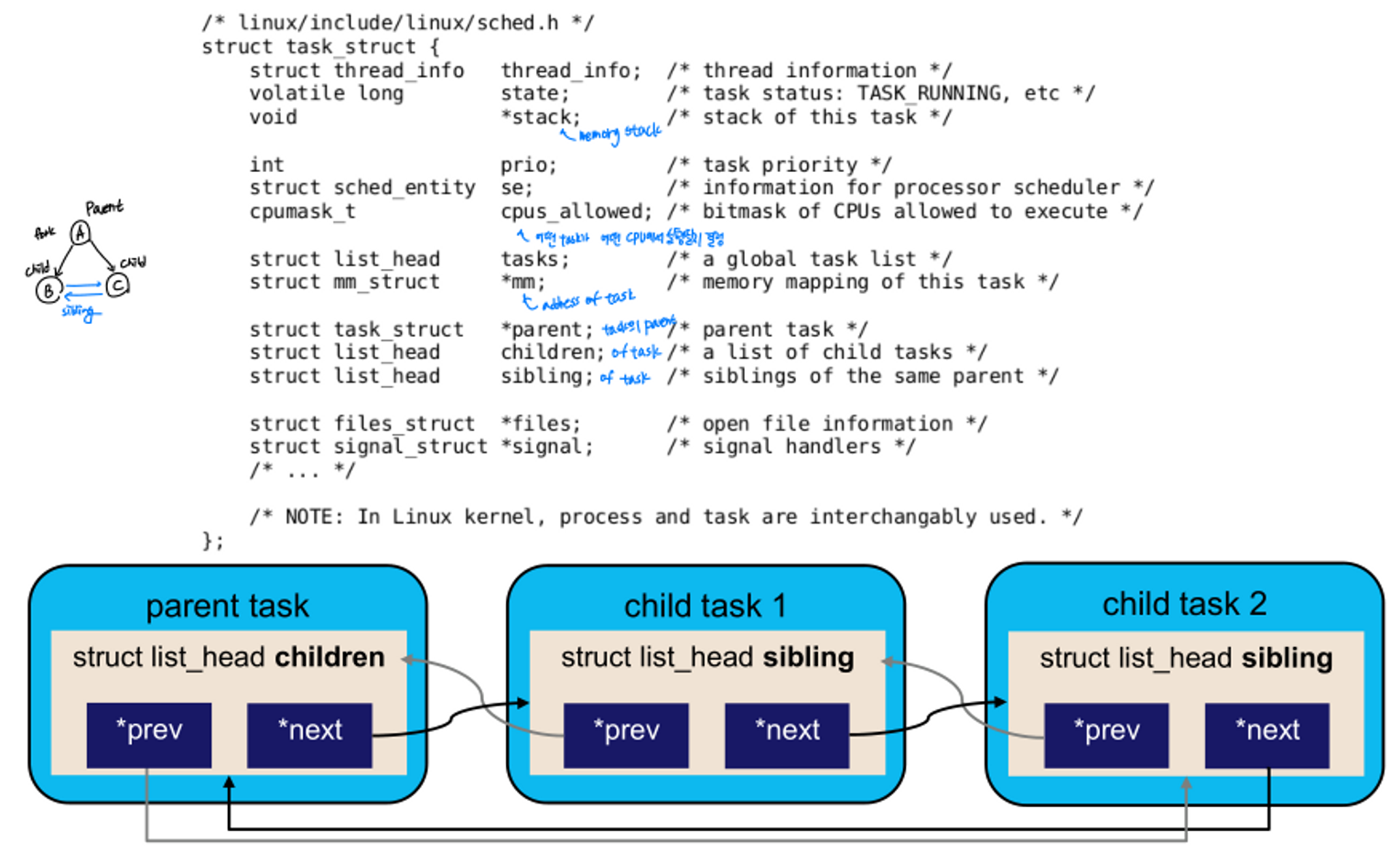 - kernel은 process의 list를 task list라 불리는 circular doubly linked list에 저장한다.