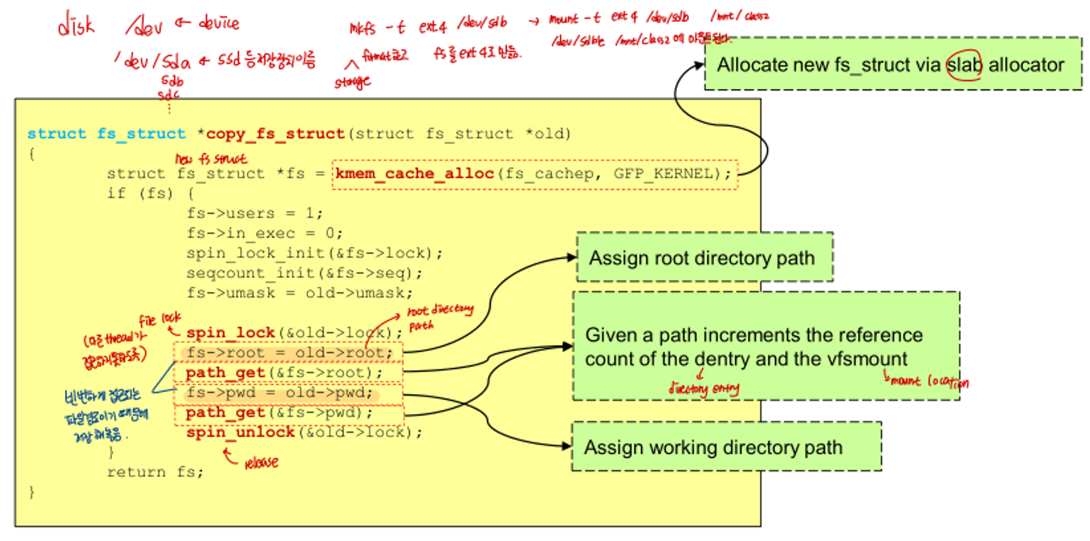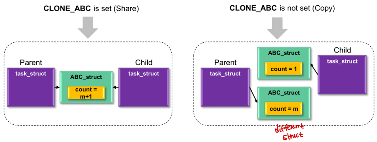 - CLONE_FS flag를 사용하면 복사하지 않고 structure 공유하고 reference count 증가