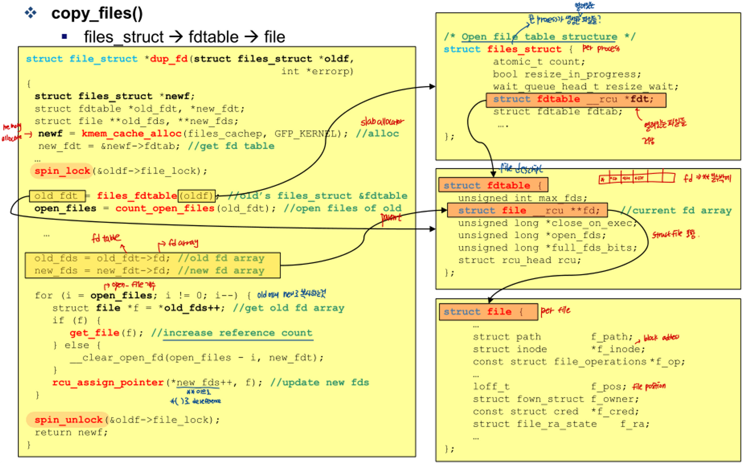 - CLONE_FILES flag가 있으면 복사하지 않고 reference count만 증가 후 함수 탈출