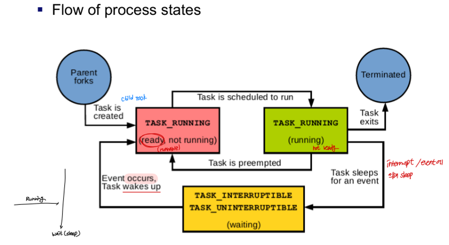 - waiting condition이 true가 되었거나, signal을 받았을 때 kernel이 process 의 state를 TASK_RUNNING으로 설정