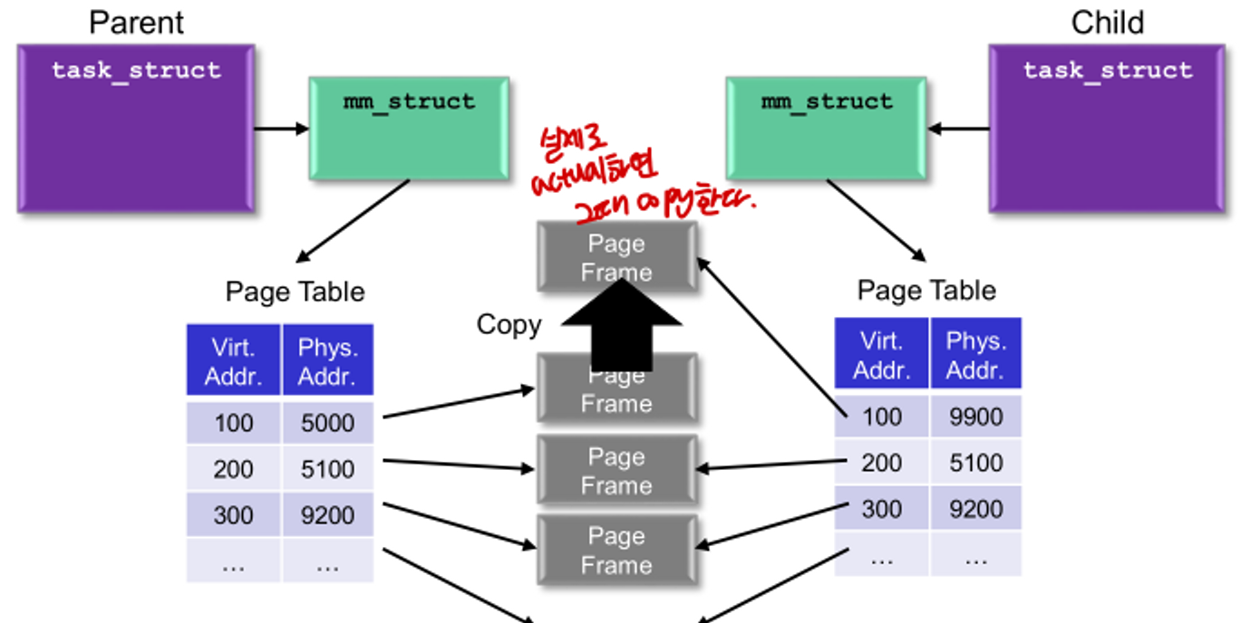 - 모든 page frame을 copy하는 것은 시간이 너무 오래 걸림