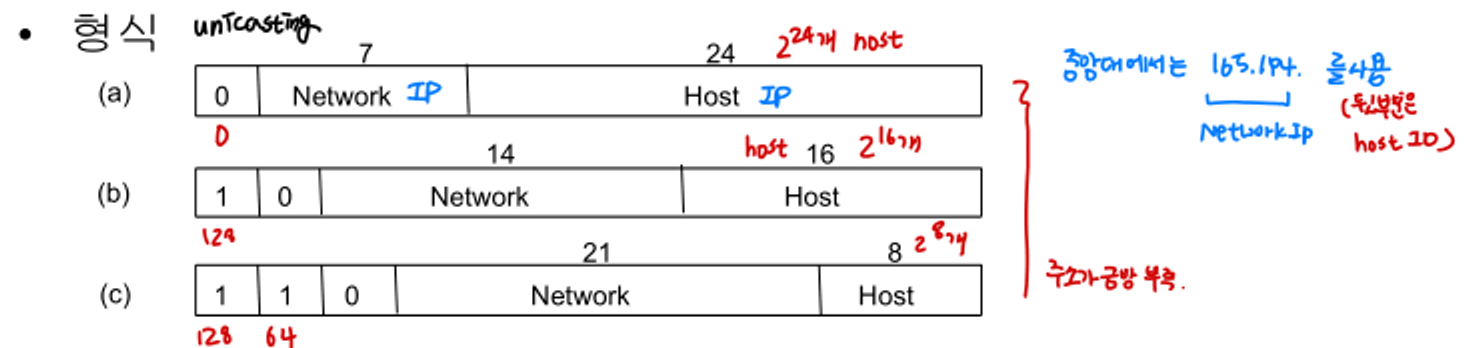 - a class : IP 주소가 0~127으로 시작. 2^7개의 네트워크 주소, 2^24개의 Host 주소