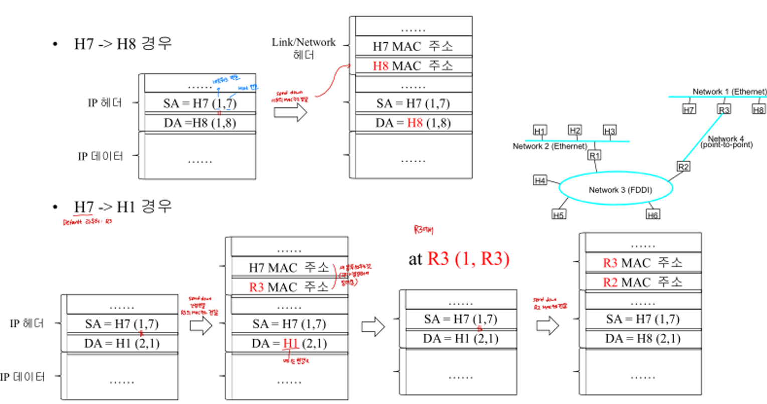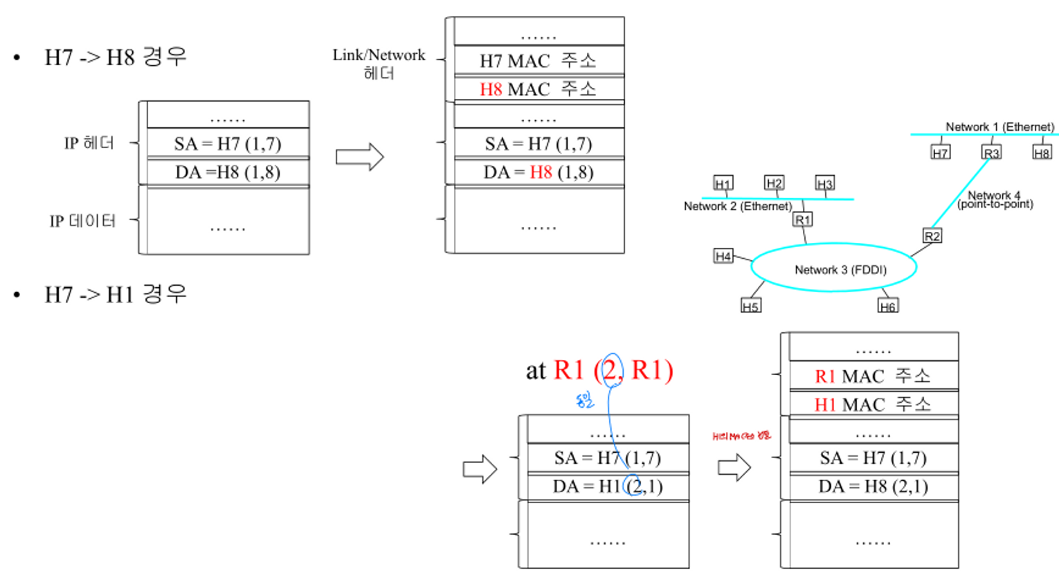 - IP 헤더의 SA : H7의 네트워크 번호 + Host 번호 (출발지)