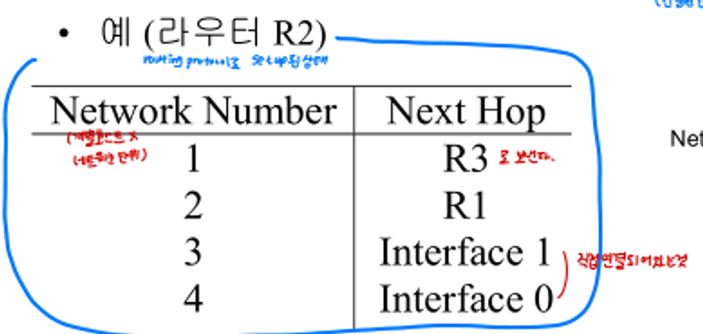 - 포워딩 테이블은 네트워크 주소(번호)에 대한 다음 홉(라우터)을 가리키고 있다.