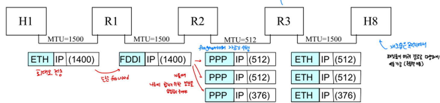- 각 네트워크는 나름대로의 MTU (Maximum Transmission Unit)를 가짐
